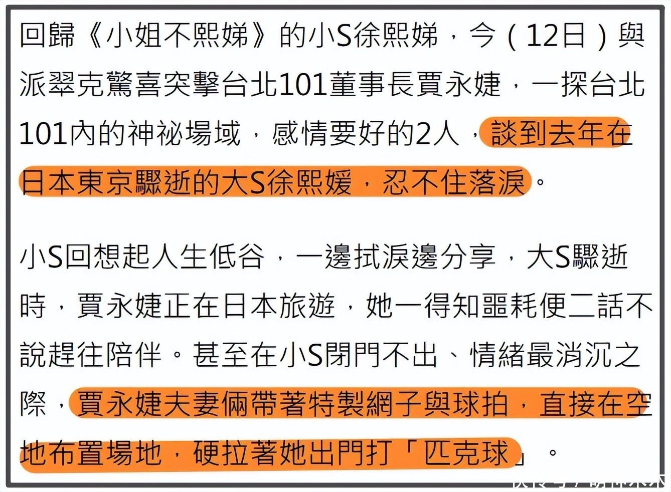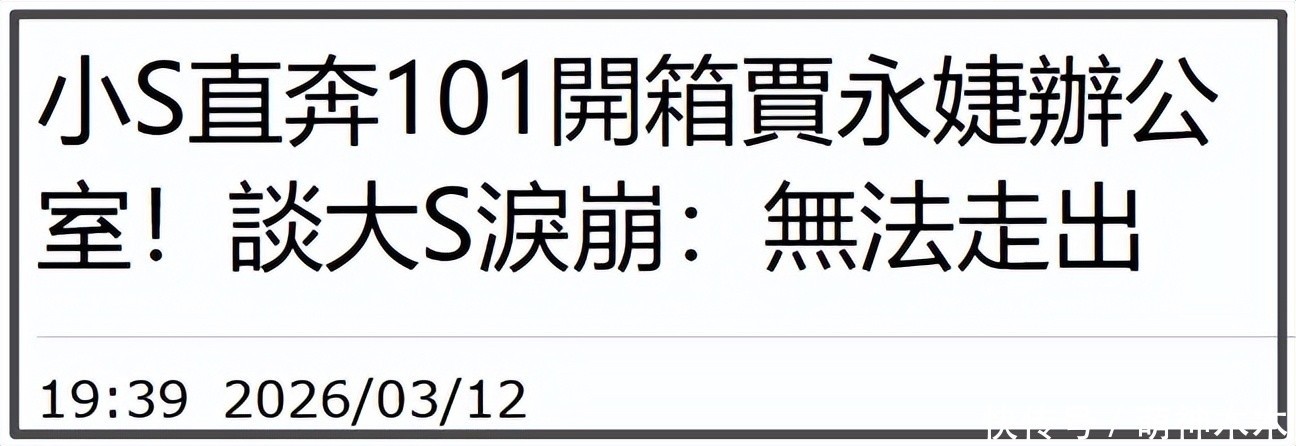 去找贾永婕为复工预热,也要提到大S,在贾永婕办公室泪崩,说自己曾一度无法走出,感谢贾永婕对她的帮助。